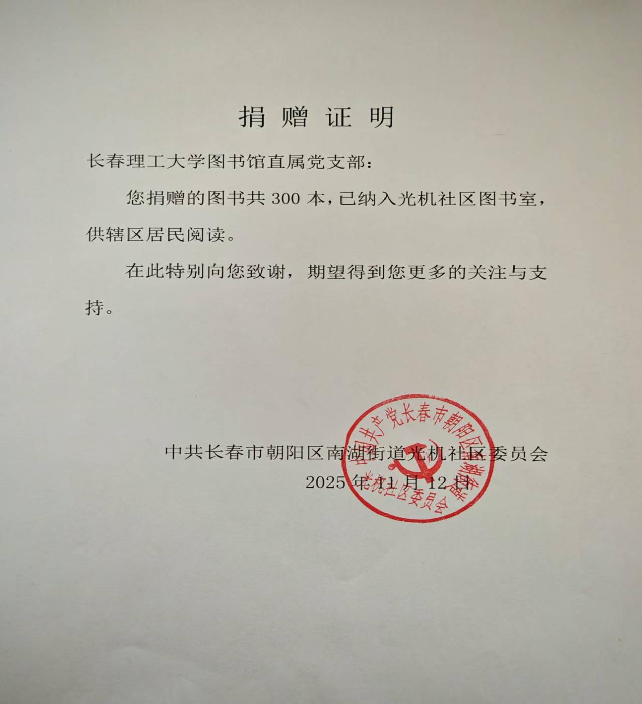此次捐赠不仅是图书的传递,更是爱心与责任的延续。未来,图书馆直属党支部将与光机社区保持紧密合作,持续营造浓厚书香氛围,让书香伴随孩子们成长,助力他们逐梦前行。