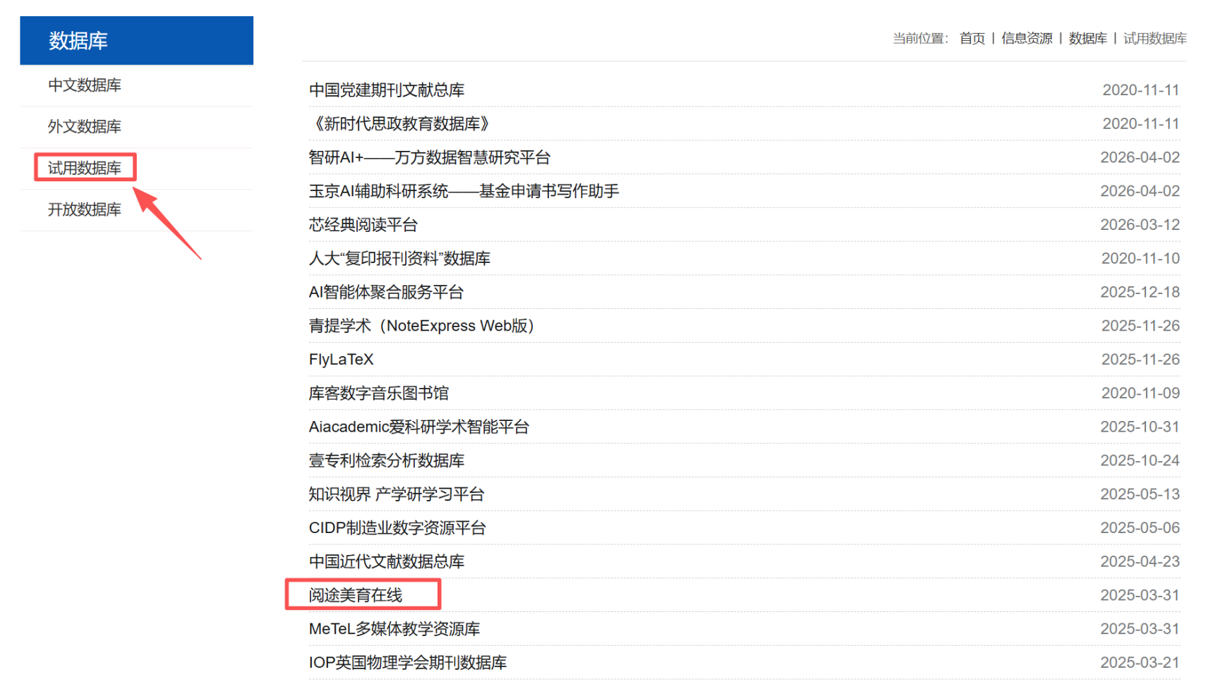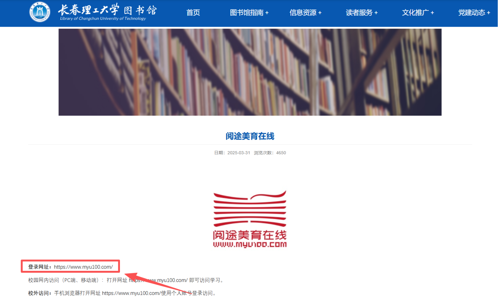 通过长春理工大学图书馆官网,选择“试用数据库”栏目,选择“阅途美育在线”进入详情页,点击网址进入『阅途美育在线』数据库。