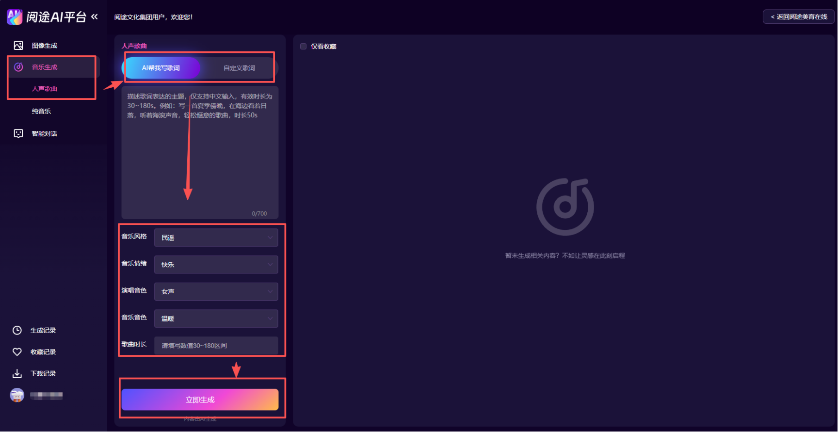 使用『阅途美育在线』音乐生成工具完成歌曲创作。『阅途美育在线』音乐生成路径:“AI创作”→“音乐生成”,输入歌词、音乐风格、音乐情绪、演唱音色、歌曲时长等内容。